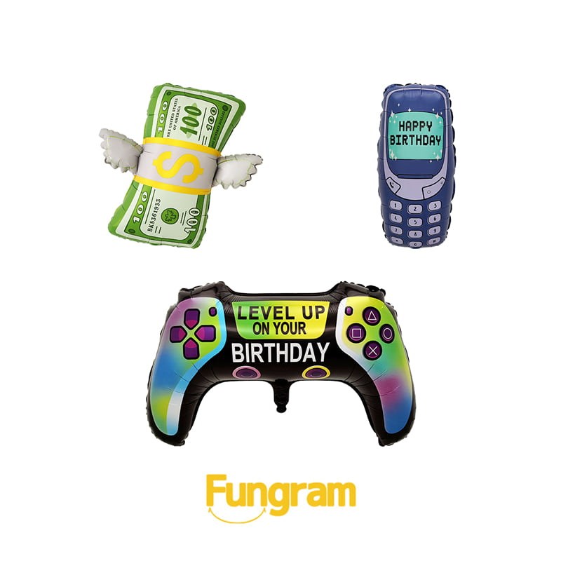 Helium / AirUnique & Fun Designs – Features a variety of birthday-themed balloons including a game controller, retro mobile phone, and money roll design, perfect for different party themes.