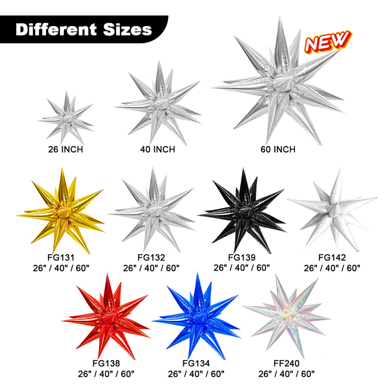 AirOur White Starburst Foil Balloons are designed to bring clean, elegant impact to high-end events and decorative installations. Now available in three sizes — 26", 40", and a new 60" option — these striking balloons are assembled from 12 individual foil star points, forming a full 3D starburst shape.